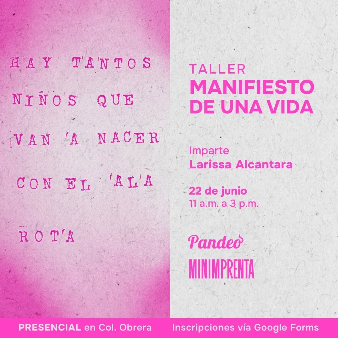 Los manifiestos son una declaración pública de principios e intenciones, a menudo de naturaleza política o artística. En este taller crearemos el manifiesto de nuestra vida, ya sea del momento presente, pasado o futuro, el sentimiento que nos rige o las circunstancias que nos atraviesan. Se trata de proponer o exponer nuestros sentipensares, nuestras reflexiones cotidianas o nuestros deseos desbordados, para lo cual revisaremos algunos ejemplos de manifiestos artísticos y políticos para guiarnos, además de hacer ejercicios